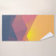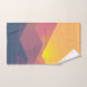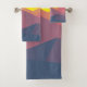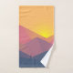 Towel set with a graphic illustration featuring many mountain tops with bright yellow sunlight setting behind the mountains. Made with geometric polygonal shapes.Simple minimalist design. Colours range from dark blue to desert red.