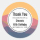 Birthday thank you stickers with a graphic illustration featuring many mountain tops with bright yellow sunlight setting behind the mountains. Made with geometric polygonal shapes.Simple minimalist design. Colours range from dark blue to desert red.