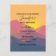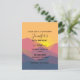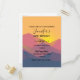 Birthday party invitation postcard with a graphic illustration featuring many mountain tops with bright yellow sunlight setting behind the mountains. Made with geometric polygonal shapes.Simple minimalist design. Colours range from dark blue to desert red.