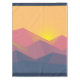 Tablecloth with a graphic illustration featuring many mountain tops with bright yellow sunlight setting behind the mountains. Made with geometric polygonal shapes.Simple minimalist design. Colours range from dark blue to desert red.