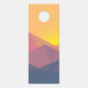 Door hanger with a graphic illustration featuring many mountain tops with bright yellow sunlight setting behind the mountains. Made with geometric polygonal shapes.Simple minimalist design. Colours range from dark blue to desert red.