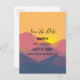 Save the date birthday / event postcard with a graphic illustration featuring many mountain tops with bright yellow sunlight setting behind the mountains. Made with geometric polygonal shapes.Simple minimalist design. Colours range from dark blue to desert red.