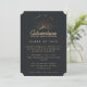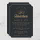 A graduation invitation with a gold coloured illustration on a black-grey background. Designed with an illustration of a mountain with the suns rays shining outward from behind. Typography says: Life is an Adventure explore dream discover.