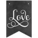 Custom Mr and Mrs wedding bunting banner features a monogram letter that can be customised with the bride and groom's married last name initial. Banner features Love in script writing along with hearts accents. White text on rustic black chalkboard textured style background.