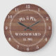 A rustic modern barn wood shiplap monogrammed wedding wall clock with date established.