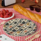 Earthy geometric pattern paper plate inspired by tribal mudcloth textiles, featuring hand-painted rectangles, diamonds, and triangles in charcoal black and terracotta on a textured beige background. A warm boho design ideal for rustic décor lovers, artisan style fans, and anyone drawn to earthy geometric aesthetics.