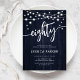 Rustic Wood 80th Birthday Party Invitation. Black & white milestone bday invite with navy wood pattern. Features fairy string lights and modern hand style lettering script font "eightly". Perfect for men's or women's adult eightieth birthday celebration.
