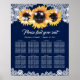 Complement your rustic navy blue wedding party with this elegant seating chart for 8 tables featuring sunflower flowers on a burlap background adorned with delicate floral lace and string lights. Matching items available.