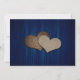 Navy Blue rustic sunflower save the date cards featuring a sunflower against a barn wood background adorned with string lights. Two burlap hearts at the back.