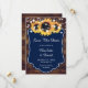 Custom rustic navy blue wedding save the date card featuring sunflowers and string lights on a barn wood background.