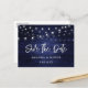 Rustic navy blue wedding save the date postcard featuring rustic wood adorned with string lights.