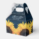 Elegant rustic navy blue wedding favour box featuring a navy blue wood background adorned with sunflowers and string lights. Easily personalise this navy blue and yellow floral favour box with your event details.