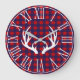 Rustic red and navy plaid clock with white numerals and white deer antlers silhouette.