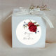 Rustic floral theme favour sticker featuring watercolor illustration of navy and burgundy peony flowers with greenery.