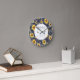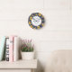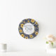 "Rustic Navy Sunflower Bee Yellow Birth Stats Baby Round Clock." A fun way to celebrate your new little one with your baby's birth stats: full name, date, time of birth, weight and length are easily customised using the template fields. Rustic white cottage wood with sunflowers, eucalyptus leaf greenery, dried foliage and bumble bees were originally hand painted by internationally licensed artist and designer, Audrey Jeanne Roberts. Copyright.