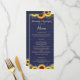 This rustic country design features gold string lights and lace along with sunflowers and lavender sprigs against a navy blue wood background. The text, with customisable bride and groom names and event details, appears in pale gold in popular script and serif typography. You can personalise this menu for your own wedding by changing the text in the template.