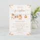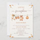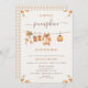 Sweet clothesline baby shower invitation for fall featuring some baby clothes, pumpkin, baby booties and autumn foliage. This a little pumpkin baby shower invitation also features a decorative calligraphy font and some foliage on the four corners.