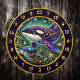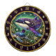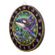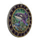 The design is enclosed in a circular frame featuring ornate golden swirls, vibrant gemstones, and celestial accents. This combination of natural elements and fantasy-inspired details makes it a standout addition to any recreational space.