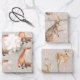 A rustic oyster gray color holiday wrapping paper sheet set featuring watercolour-painted winter animals: a doe reindeer, a hare rabbit and a red fox experiencing their first snowfall in a repeat pattern on a warm vintage muted oyster gray color background.