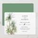 Rustic watercolor island palm tree wedding invitation. Coordinating sage green colour backing. Invitation features chic typography design style mix of calligraphy and bold type.