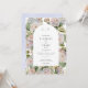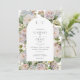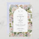 This simple but elegant wedding invitation design features a beautiful hydrangea floral background of dusty pink, soft periwinkle blues and purples with greenery. The text is displayed on an arched white background, and the design is completed with the first initial of the bride and groom. This design is part of the Rustic Pastel Hydrangea Floral Monogram wedding suite of cards. Created by Simply Farmhouse Press.