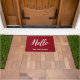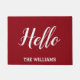 Welcome your guests with this rustic red background door mat with your family name and a white typography "hello".