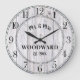 A rustic modern white washed barn wood shiplap monogrammed wedding wall clock with date established.