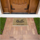 Welcome your guests with this rustic burlap background door mat with your family name and a black typography "hello".