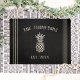 Welcome guests to your abode with this charming rustic farmhouse style doormat. Personalized design features your family name or farm name in neutral tan lettering, along with your year established and a pineapple illustration. Rope stripe detailing on a rich black background completes the design.