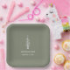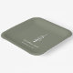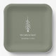 Rustic sage green wedding paper plate, with a simple pine tree and customisable typography design. A casual addition to your wedding reception party supplies.