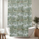 Beautiful rustic winter tree pattern shower curtain set on a green background. Design features forest trees, mountains, deer and flying birds. Visit our shop to view our matching bath towels.