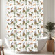 Beautiful rustic forest trees with a bear, buck and fox pattern shower curtain set on a neutral white background. Visit our shop to view our matching bath decor items.