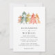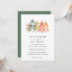 Simple and rustic wedding invitation featuring a watercolor abstract of sage green, red, gold and orange pine trees and minimal modern typography.