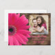Rustic, bold pink gerbera daisy flower and woodgrain photo wedding save the date postcard. Bold large pink gerber daisy paired with your engagement photo and dark brown woodgrain wood background. Additional wording on the back as well.