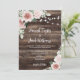 Allow your guests to feel the rustic charm of your wedding with this blush pink floral wedding invitation. The background features a barn wood look with string lights and a bouquet of roses and eucalyptus, giving the invitation country charm. This sweet and romantic invitation is perfect for a rustic outdoor wedding and will leave your loved ones eager to join you for your special day.