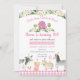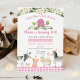 This cute birthday invitation features watercolor farm animals with pink floral accents, confetti and a pink gingham border.