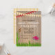 This potluck picnic invitation features a rustic design. Red and yellow plaid flag banners, grass, and watermelon accent the wood background.