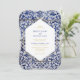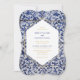 This design features rustic Portuguese tile patterns. The wedding text is elegantly framed with a white and gold colour geometric shape. Unique Azulejo blue and white floral wedding invitation design with modern elements. Matching wedding stationery items and other wedding invite formats are also available.