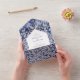 This design features rustic Portuguese tile patterns. The wedding text is elegantly framed with a white and gold colour geometric shape. Unique Azulejo blue and white floral wedding invitation design with modern elements. Matching wedding stationery items and other wedding invite formats are also available.