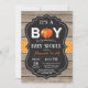 Rustic Pumpkin Fall Baby Shower Invitation Card with rustic wood, orange and chalkboard background. For further customisation, please click the "Customise it" button and use our design tool to modify this template.