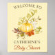 This pretty baby shower welcome poster features a yellow and white polka dot background with a watercolor pumpkin and decorative autumn leaves. Add you name to customise this welcome sign for your special day.
