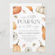 Charming fall baby shower invitations utilise both the front and back of the card to eliminate the need for enclosure cards. Design features a border of muted cream and orange pumpkins and fall leaves, with your baby shower details in grey lettering. "Our little pumpkin is on the way" appears at the top. Perfect for autumn or Halloween season baby showers. Customise the back with additional details, including a custom QR code for your registry. Shown with text fields for a diaper raffle, books for baby, and unwrapped gift request.