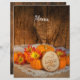 Customise the charming Rustic Pumpkins Fall Barn Wedding Menu with the details of the meal that you will serve at your casual yet classy September, October or November autumn bridal shower luncheon, marriage reception dinner or post wedding brunch by adding the salad or first course, entree or second course and dessert or third course. This country chic custom rustic autumnal nuptial menu features a digitally enhanced floral photograph of little orange pumpkins, red and yellow daisy flower blossoms, white bridal veil, natural wood slice with the word LOVE burned on it and a vintage lace trimmed linen handkerchief with a burlap and brown weathered barn wood background.