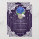 Rustic purple and blue wedding invitations featuring a hydrangea and baby's breath bouquet inside a mason jar on a wood and floral lace background. Perfect card design for inviting your guests to your purple and blue rustic country wedding party inspired by hydrangea flowers. Easy to personalise card.