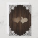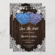 Romantic rustic purple and blue floral wedding save the date cards featuring hydrangea flowers against a barn wood background adorned with white floral lace and string lights.