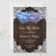 Romantic rustic purple and blue floral wedding save the date cards featuring hydrangea flowers against a barn wood background adorned with white floral lace and string lights.