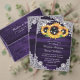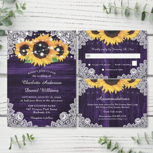 Elegant sunflower wedding invitations ideal for a romantic purple rustic wedding party inspired by sunflower flowers. Matching items available.