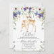Sweet gender neutral woodland deer themed baby shower invitation. This design features a doe and fawn as well as a purple and white floral arrangement .