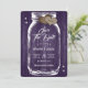Rustic purple wedding save the date card featuring a mason jar and burlap hearts against a barn wood background adorned with twinkle lights. Easily personalise this romantic rustic purple wedding save the date online. Matching items available to complement this purple wedding save the date card.