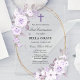 Elegant and feminine First Communion invitation features beautiful pale lavender purple roses and white magnolia flowers decorating an oval gold frame. All of the text is editable so you can also use it for any type of religious ceremony, Baptism, Christening, Dedication or Confirmation.